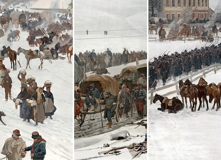 Mit den 87 000 Soldaten gelangten 1871 auch 12 000 französische Armeepferde in die Schweiz. Jede Menge Grund also, sich für einmal in die Perspektive von «Feuille» zu versetzen – so heisst die Stute in der Ausstellung «Mein 1871. Spuren, Schicksale, Geschichten» nämlich namentlich. An ihrem und den weiteren beiden persönlichen Schicksalen wird die grosse Herausforderung deutlich, welche der Übertritt der Bourbaki-Armee für die Schweiz bedeutete. Neben Feuille finden sich auch die Spuren von Joséphine und Edouard vor. Joséphine ist eine junge Dorfbewohnerin, die ihren Korb voll packt und den ankommenden Soldaten zu Hilfe eilt. Bei Edouard handelt es sich um Edouard Castres, den späteren Maler des Rundbildes. Letzterer hat die Internierung als Rotkreuzhelfer miterlebt. Das Bourbaki Panorama ist gleichsam Ausdruck seiner Erfahrungen und seiner grossen Friedensbotschaft.