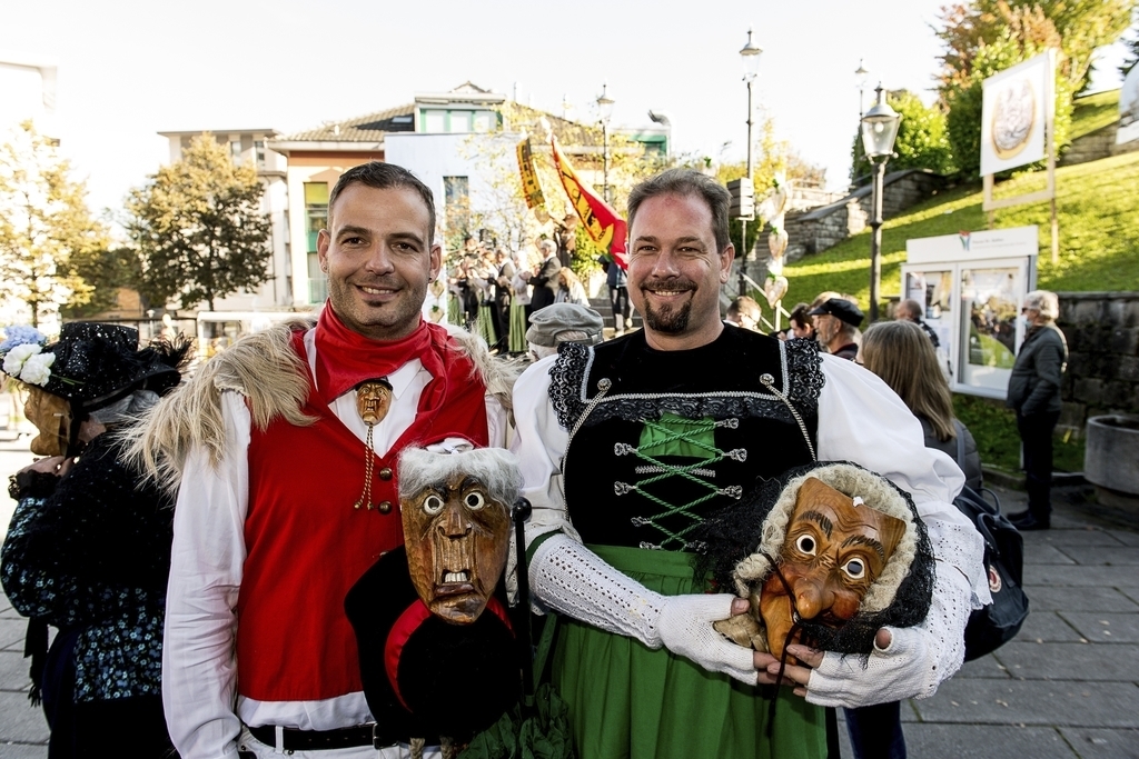 Von den «Original Krienser Masken» waren Michael Eicher (links) und Stephan Kurmann an der Präsentation.